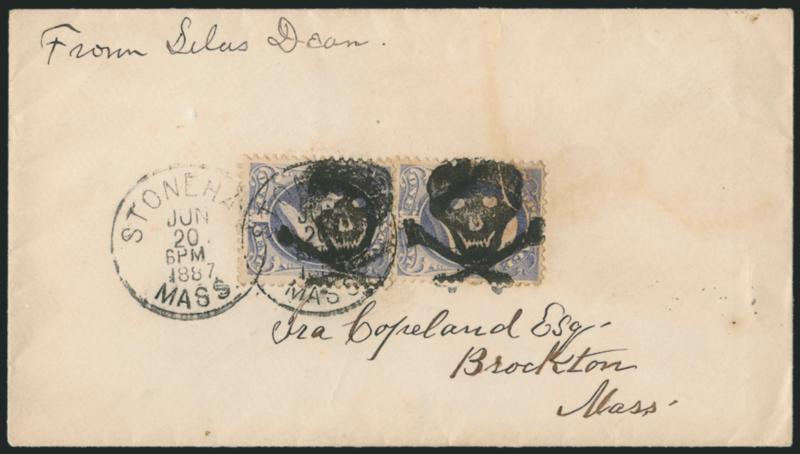 1c Gray Blue (206). Two, tied by two bold strikes of Large Skull & Crossbones fancy cancel and "Stoneham Mass. Jun. 20, 6PM 1887" circular datestamps on cover to Brockton Mass., receiving