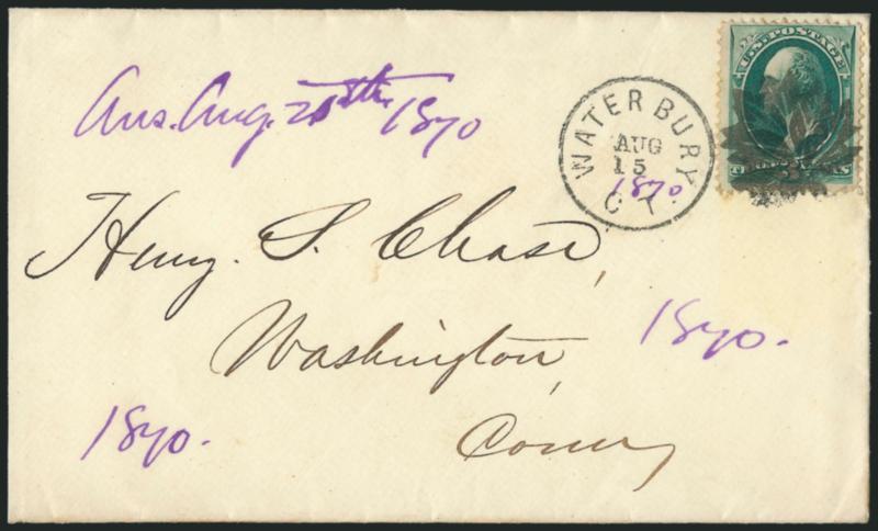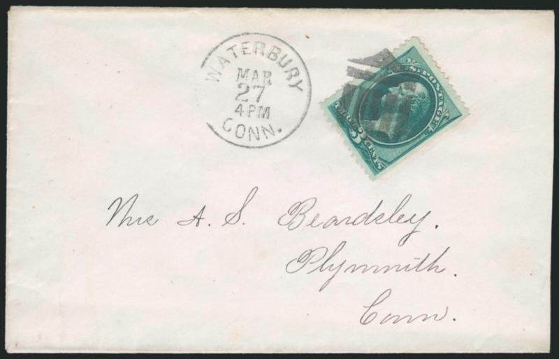3c Green (158). S.e. at left, tied by Shield fancy cancel of Waterbury Conn., (Rohloff Q-7), "Waterbury Conn. Mar. 27 4PM" circular datestamp, on cover to Plymouth Conn., barely reduced at