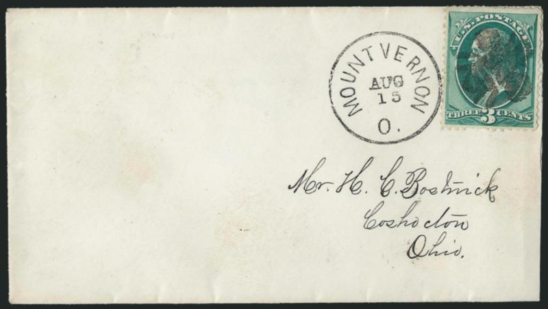 3c Green (147). Bold strike of Winged Bug fancy cancel with matching "Mount Vernon O. Aug. 15" circular datestamp on small neat cover to Coshocton O., stamp with small pre-use tear at left,