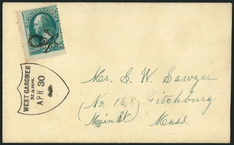3c Green (184). Cancelled by clear strike of Skull & Crossbones fancy cancel, matching "West Gardner Mass. Apr. 30" shield datestamp, barely reduced at right, Extremely Fine strike, this