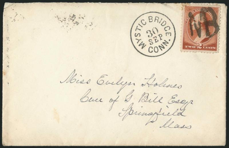 2c Red Brown (210). Cancelled by "MB" fancy cancel, "Mystic Bridge Conn. 30 Sep." circular datestamp on cover to Springfield Mass., receiving backstamp, minor edgewear, some trivial soiling