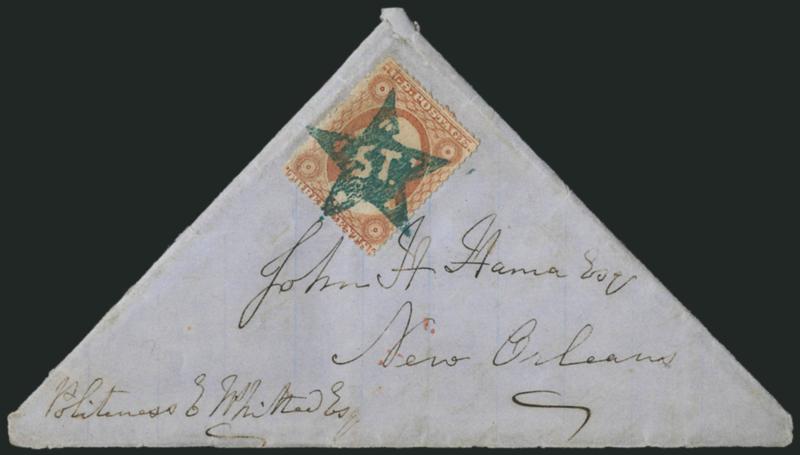 VERY FINE STRIKE OF THE RARE "ST" IN STAR FANCY CANCEL ON A TRIANGULAR-SHAPED FOLDED LETTER. A WONDERFUL EXHIBITION ITEM AND BELIEVED TO BE THE ONLY RECORDED COVER WITH THIS MARKING.