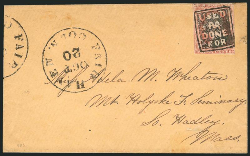 EXTREMELY FINE. A SUPERB STRIKE OF THE RARE NEGATIVE "USED & DONE FOR" FANCY CANCELLATION. ONLY TWO ARE RECORDED ON COVER, AND THIS IS THE FINER OF THE TWO. ONE OF THE MOST OUTSTANDING FANCY CANCELLATIONS OF THE CLASSIC IMPERFORATE STAMP ERA.