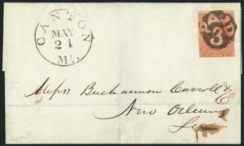 Canton's postmaster is well known for his fancy cancellations, including a Lyre, Star in Rope Circle, Negative Star, Negative "Paid 3", Christian Cross and an unusual Open Triangle, as well as the star used as a Confederate postmaster's provisional. This is the most elaborate of the Canton designs. (Image)