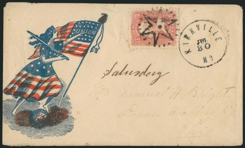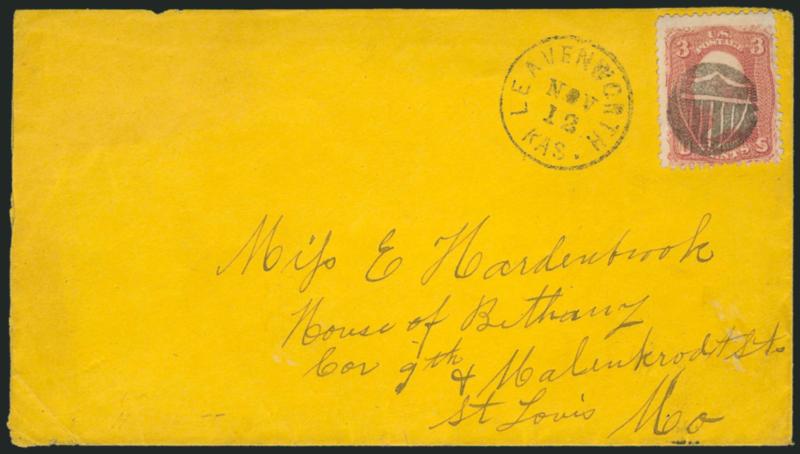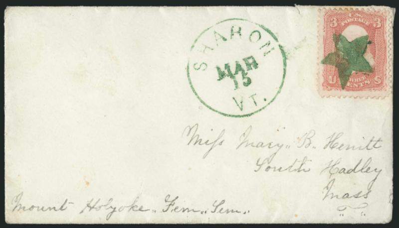 The creation and use of this fancy cancel in the Spring of 1866 coincided with the return of soldiers from the Civil War. It is known on at least one domestic cover, but apparently the cancelling device migrated to the foreign-mail exchange office, where it was used to cancel stamps on mail to foreign countries. This explains why it is found on high values of the 1861-66 Issue, including the 10c, 12c, 15c, 24c, 30c and 90c denomination stamps off cover. Covers with this cancel are very rare, probably because European stamp collectors removed the high-value stamps from covers. We recently offered one to Italy in Part One of the Raymond Vogel collection (realized $32,500 hammer).