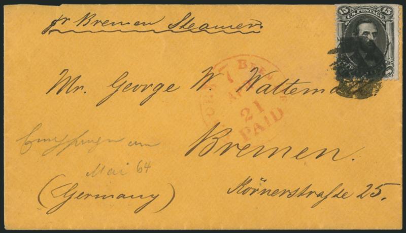 This is the only 15c Lincoln cover with the Soldier's Head cancel known to us. There is no year-dated marking on the cover (the pencil note in German must refer to something other than content, such as enlistment date for a soldier). The Soldier's Head cancel was used only in 1866, therefore, this must be April 21, 1866. This cover moved up to become the earliest documented use of the 15c Lincoln stamp after the April 14 cover (ex Landau) received a negative certificate. However, we are not convinced that the stamp on the April 14 cover did not originate. Contemporary reports indicate that the 15c Lincoln stamps were issued in April 1866, coinciding with the one-year anniversary of Lincoln's assassination. This cover was probably carried on the North German Lloyd's Hansa, which departed New York on April 21, 1866, and arrived in Bremen on May 4.