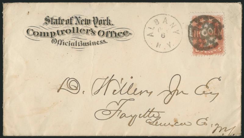 Very few strikes of this Lincoln memorial cancellation are known on cover, and most are blurry or weak strikes. The New York State Comptroller in 1866 was Thomas Hillhouse. The Albany postmaster in 1866 was George Dawson. Both Hillhouse and Dawson were ardent pro-Union Republicans. (Image)