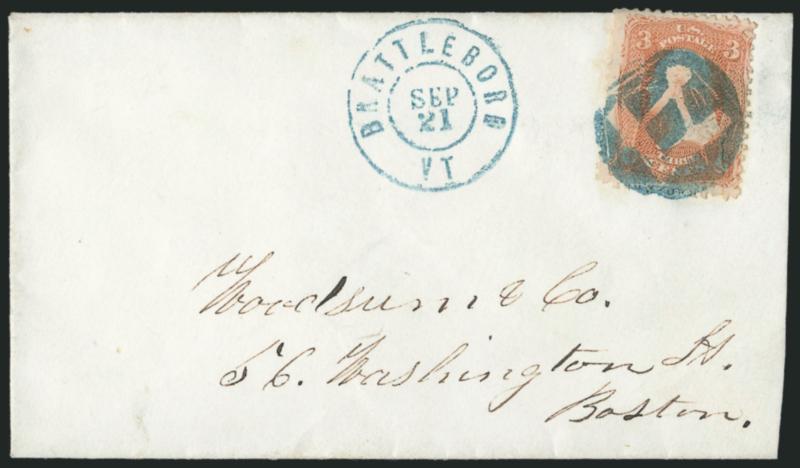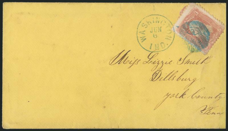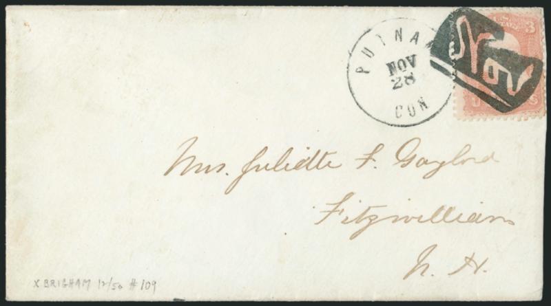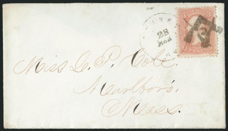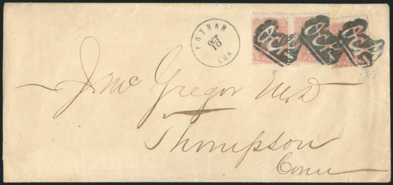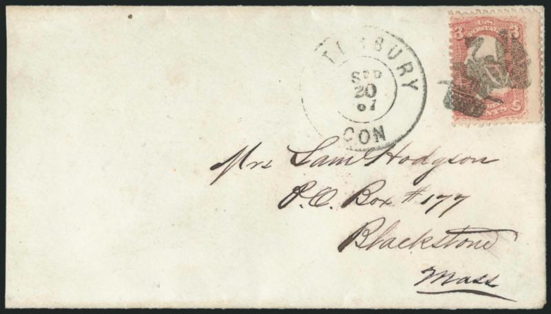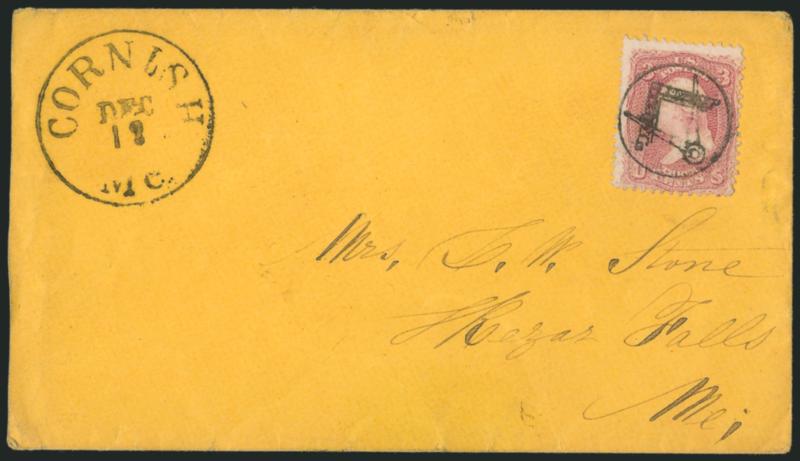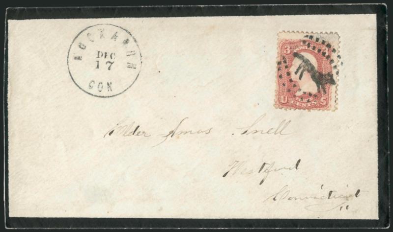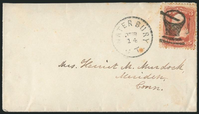 VERY FINE STRIKE OF THIS RARE MORTAR AND PESTLE FANCY CANCEL OF WATERBURY. THIS IS THE FIRST OF THIS TYPE ON COVER WE HAVE OFFERED SINCE KEEPING COMPUTERIZED RECORDS.
