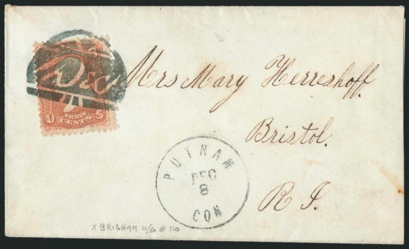 A history of the fascinating Hockanum Running Fox cancel, written by Connecticut postal historian William J. Duffney, can be downloaded as a PDF file at http://web.me.com/ctpostroad1/CtPP/Postal_Markings_files/Dudley%27s%20Fox%20Story%20Dec%202010%20LR.pdfThe Running Fox cancel was carved by postmaster Dudley Fox, who was also a silversmith, giving him the skills to carve an intricate fancy cancel. Duffney reports five covers with the Running Fox cancel (all types, facing right or left). This is one of the finest. (Image)