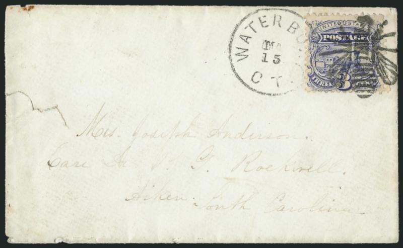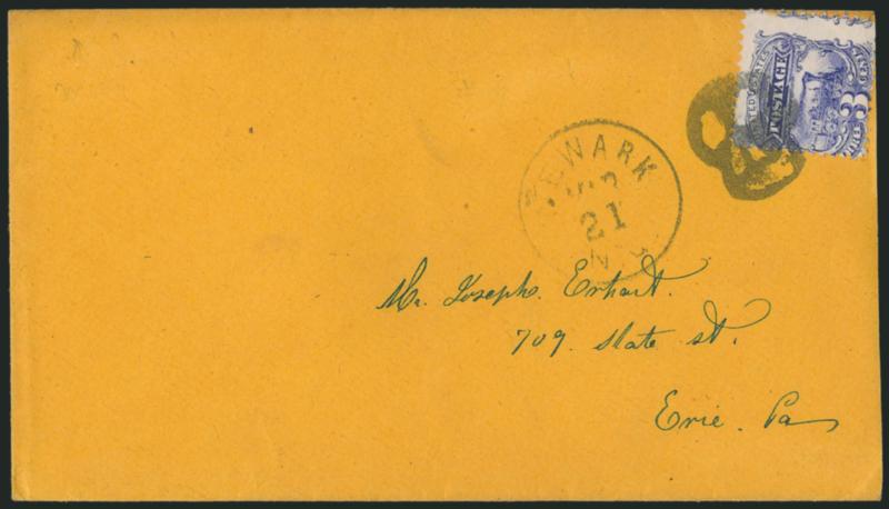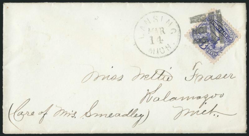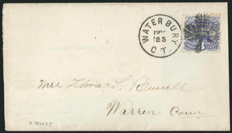 EXTREMELY FINE. AN OUTSTANDING EXAMPLE OF POSTMASTER JOHN W. HILL'S "THREE-LEAF CLOVER" FANCY CANCEL USED ON CHRISTMAS DAY 1869.