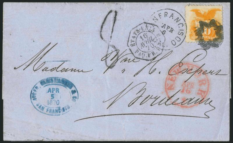 201 c Image10c Yellow (116). Vibrant color, tied by Hollow Star fancy cancel and also by matching "San Francisco Cal. Apr. 6" circular datestamp on blue 1870 folded letter to Bordeaux, France, red "New-York Apr. 16" transit datestamp, neat "8" decimes due marking, receiving backstamp, light horizontal file fold well away from stamp, Very Fine, carried aboard the French Line's Ville de Paris, with 1994 P.F. certificate (Image)