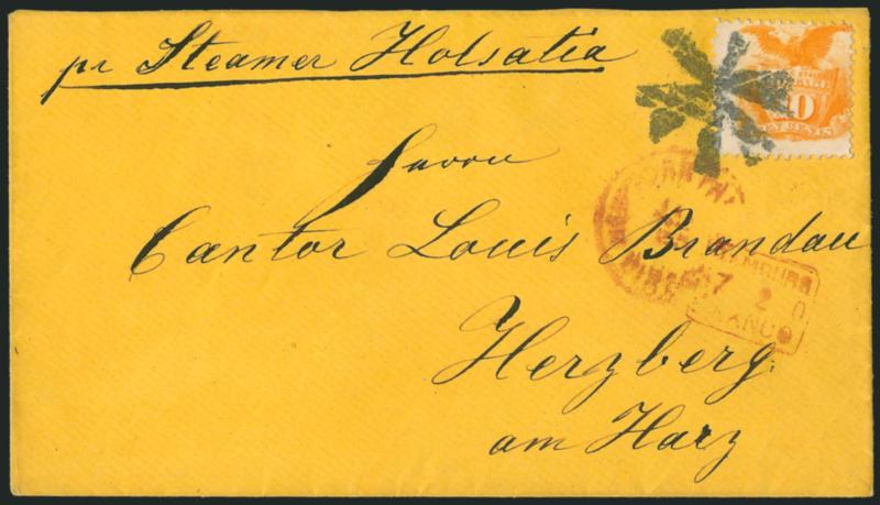 202 c Image10c Yellow (116). Vibrant color, centered to top right, tied by unusual Pinwheel cancel on yellow cover to Herzberg, Germany, red "New York Paid All Jul. 25" (1869) circular datestamp, red boxed "Hamburg Franco" handstamp, stamp with small corner crease at bottom right, Fine appearance, attractive cover, carried aboard the HAPAG's Holsatia, with 1996 P.F. certificate (Image)