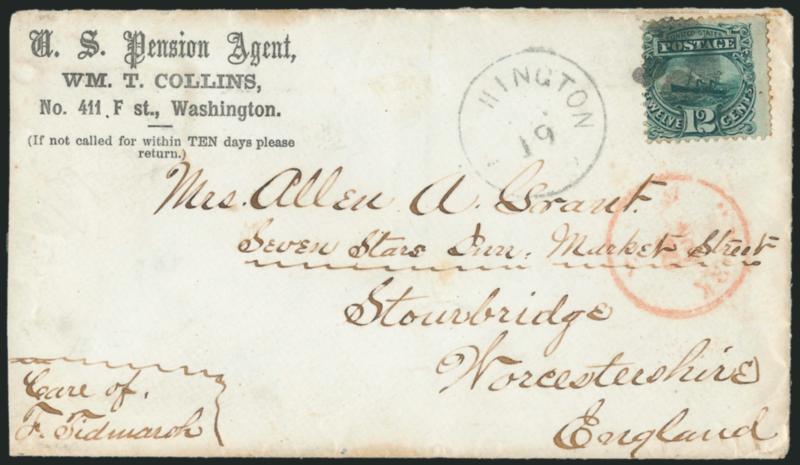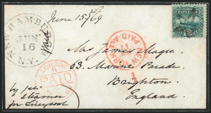 206 c Image12c Green (117). Rich color, tied by neat strike of Outline Star fancy cancel, "New Hamburgh N.Y. Jun. 16" circular datestamp on 1869 mourning cover to Brighton, England, red "New York Paid All Jun. 17" transit datestamp, red London Paid transit, receiving backstamp, fresh and Very Fine, a similar cover, sent six days after this one, was offered in our sale of the Eubanks collection, with 1997 P.F. certificate (Image)