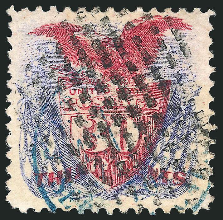 231   Image30c Ultramarine & Carmine (121). Deep rich colors and proof-like impressions, wide margins, cancelled by very unusual grid of tiny squares handstamp and also by blue French entry datestamp, Very Fine and choice, with 1991 P.F. certificate, Scott Retail with premium for blue cancel but not for French cancel (Image)