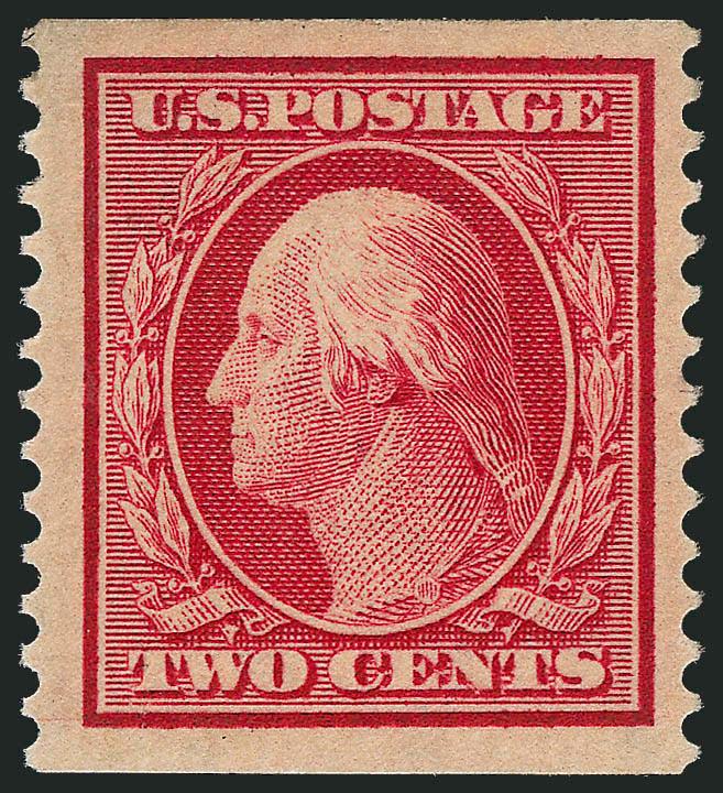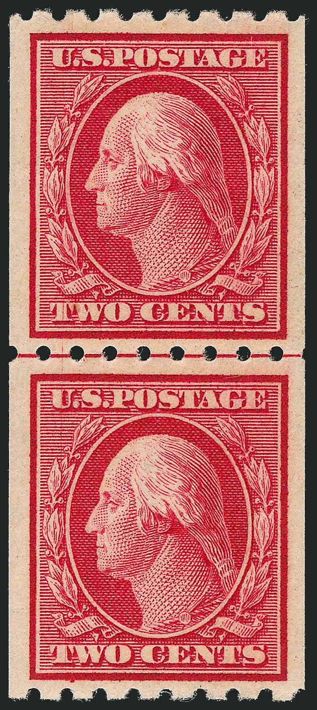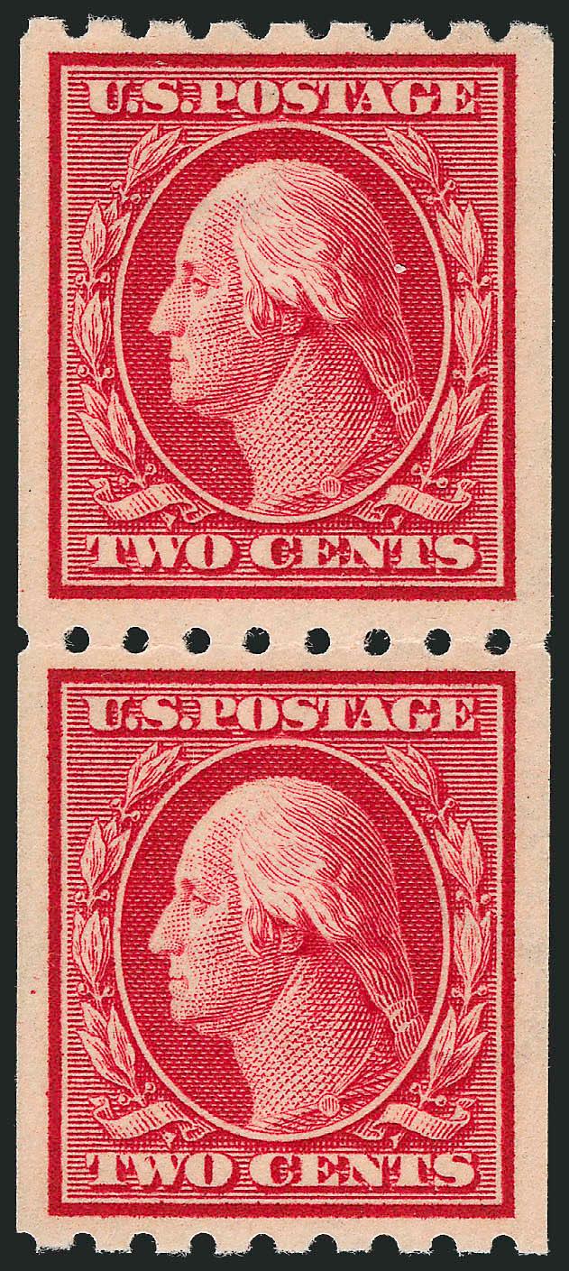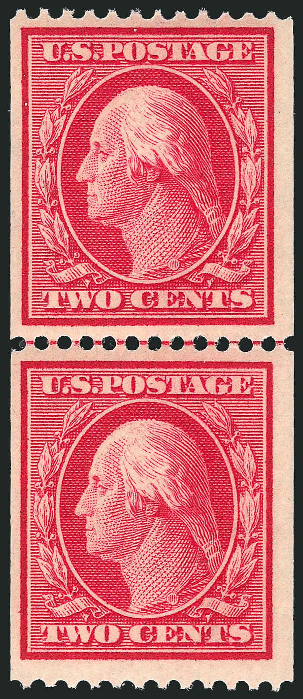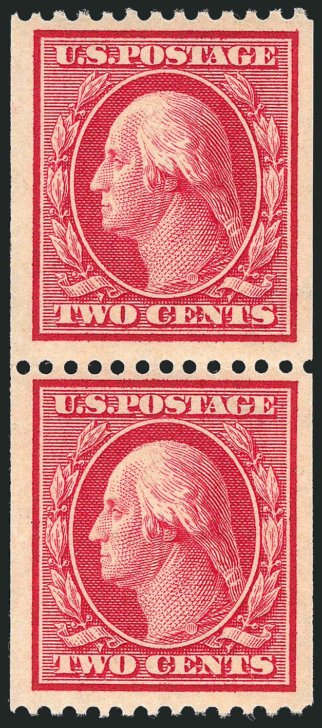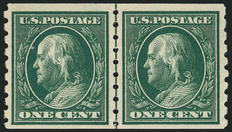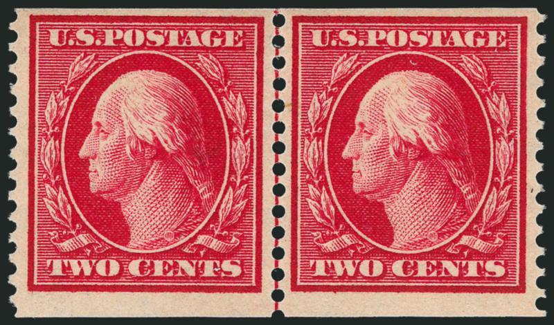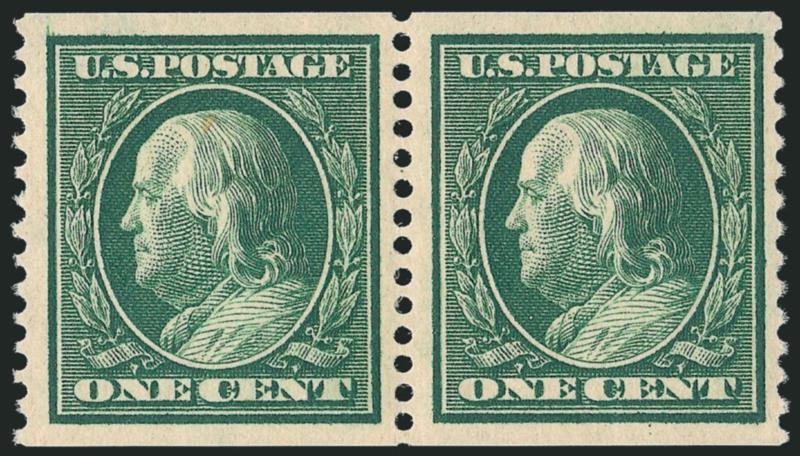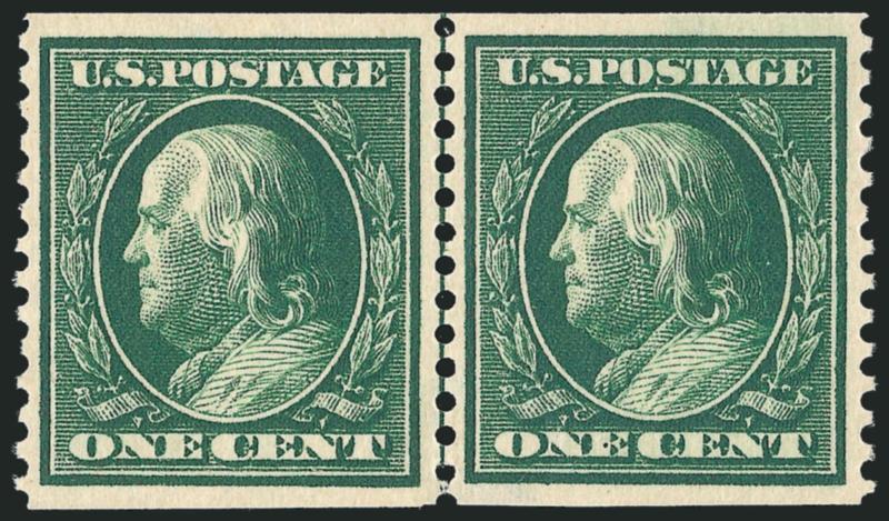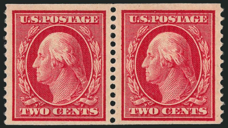 The One-Cent Perf 12 horizontal coil with single-line watermark is a true rarity as a guide line pair in Mint N.H. condition. A review using Power Search revealed that this is the first example we have offered since 2003.