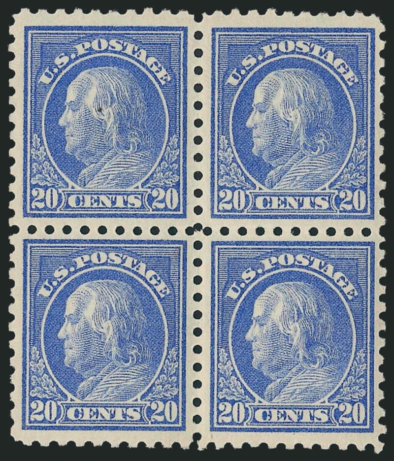 1914 nhbl Image20c Ultramarine (438). Mint N.H. block of four, nicely balanced margins, fresh color, tiny natural inclusion top left stamp, Very Fine, a scarce stamp as a Mint N.H. block, Scott Retail as singles (Image)