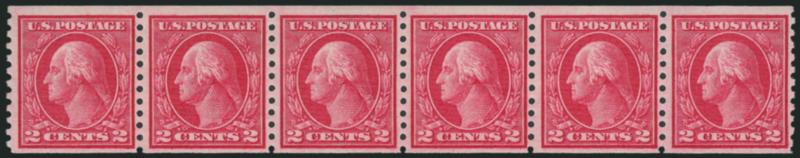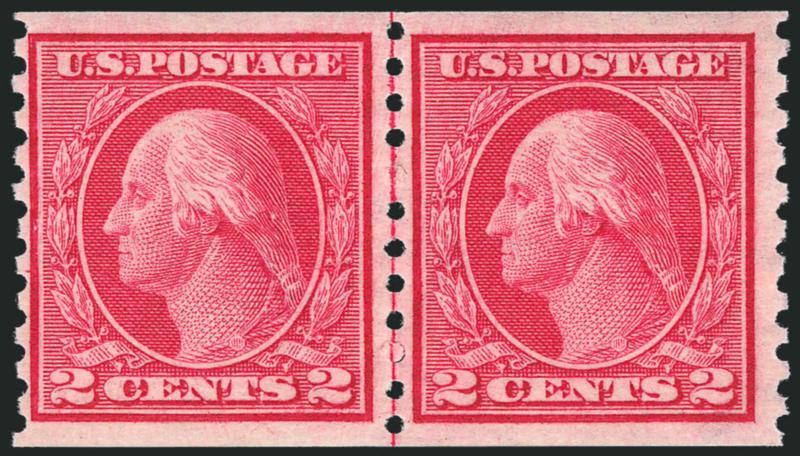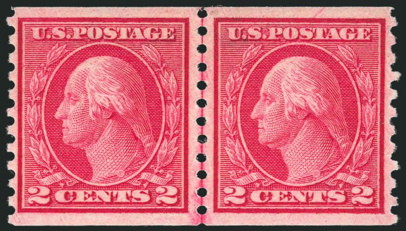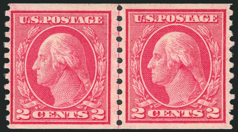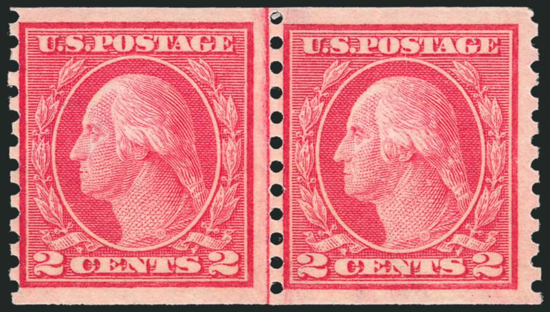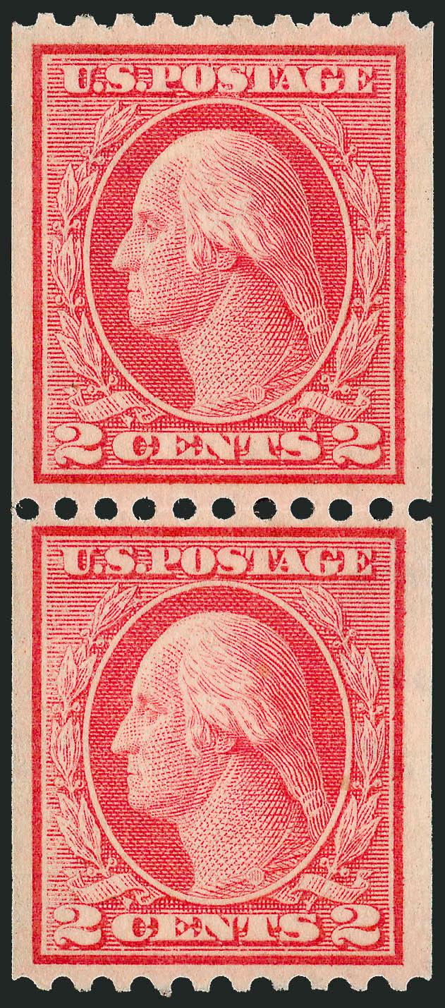 EXTREMELY FINE. A BEAUTIFUL PAIR OF THE 2-CENT TYPE I VERTICAL COIL, SCOTT 449. ESPECIALLY DESIRABLE WITH THE BOTTOM STAMP IN MINT NEVER-HINGED CONDITION.