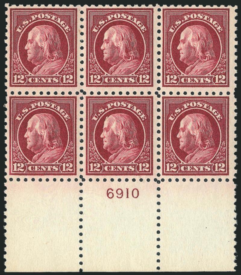 12c Claret Brown (474). Mint N.H. wide bottom plate no. 6910 block of six, attractive margins and centering, vivid color, fresh and Very Fine (Image)Search for comparables at SiegelAuctions.com |