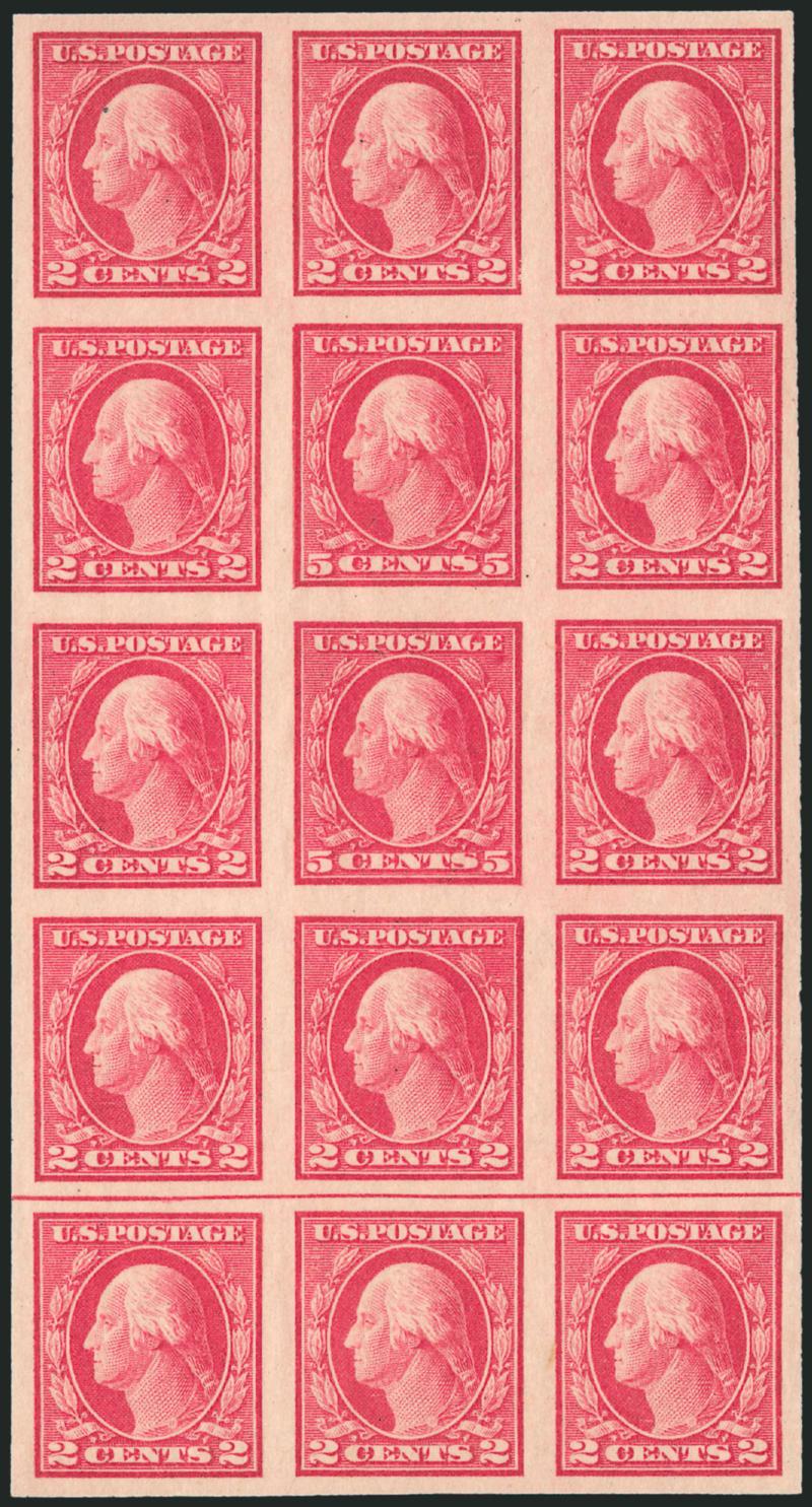 EXTREMELY FINE. A BEAUTIFUL MINT NEVER-HINGED EXAMPLE OF THE 5-CENT IMPERFORATE ERROR IN A BLOCK OF FIFTEEN. AN IMPRESSIVE MULTIPLE.