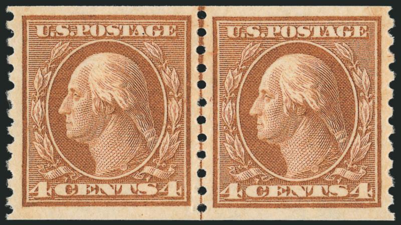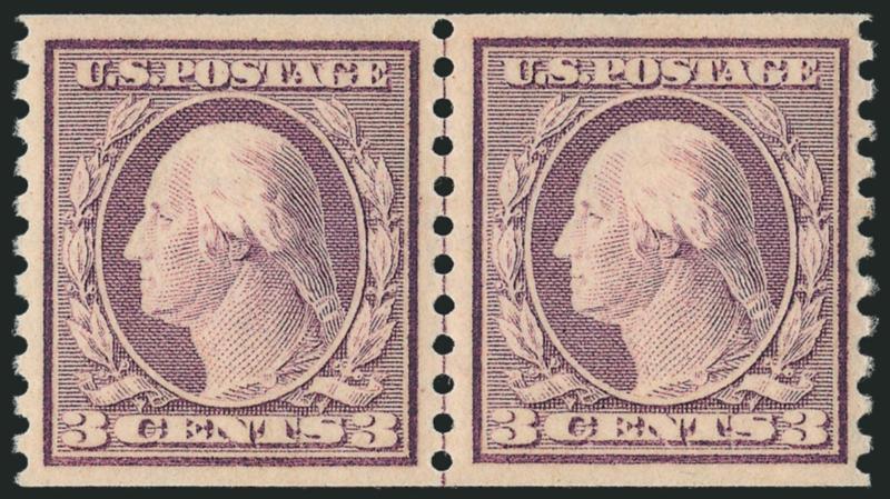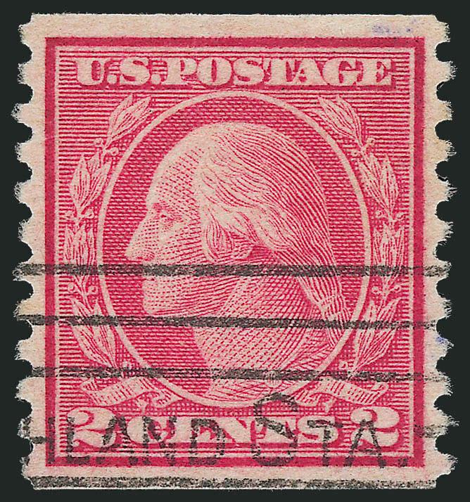 During the course of production of the normal 2c plate No. 7942, three positions were noted to be defective. The plate was returned to the siderographer, who burnished out the three positions and mistakenly re-entered them using a transfer roll for the 5c stamp. The error passed unnoticed and the sheets were issued to the public Perf 10, Imperforate and Perf 11 (Scott 467, 485 and 505). The imperforate is by far the rarest of the three.