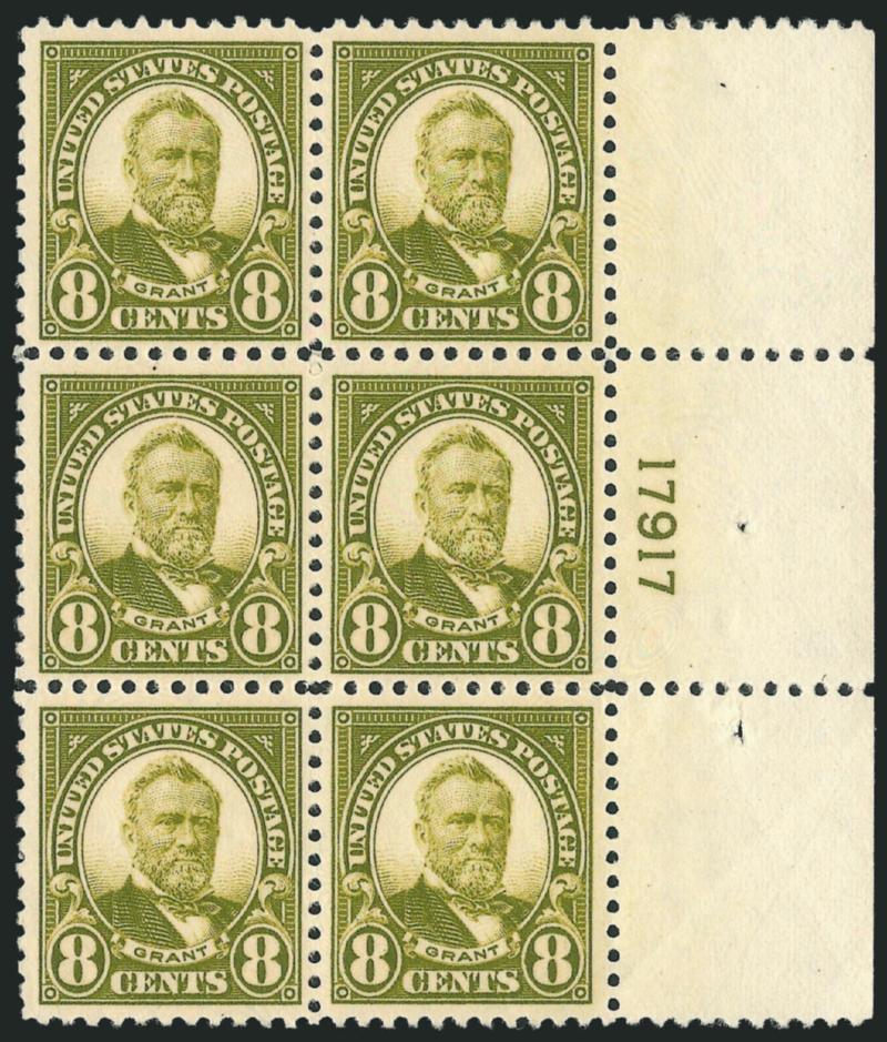 8c Olive Green (560). Mint N.H. right plate no. 17917 block of six, well-centered with pristine color, light natural gum bends, Very Fine (Image)Search for comparables at SiegelAuctions.com |
