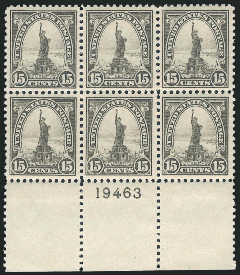 15c Gray (566). Mint N.H. bottom plate no. 19463 block of six with wide selvage, bright color, unusually choice centering, Extremely Fine Gem, a beautiful Mint N.H. plate block (Image)Search for comparables at SiegelAuctions.com |