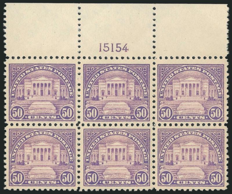 50c Lilac (570). Mint N.H. top plate no. 15154 block of six, wide margins and choice centering, bright color, small natural gum skips, Extremely Fine
