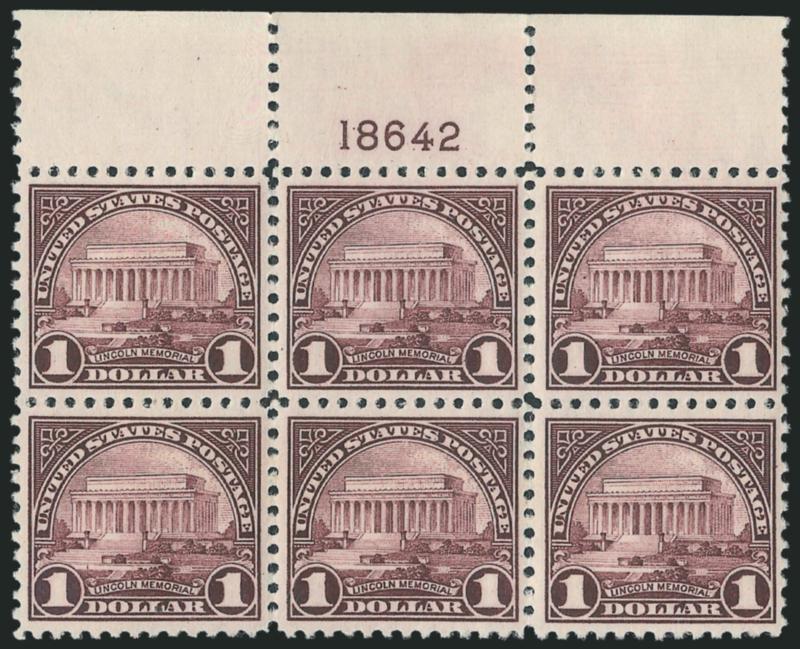 $1.00 Violet Black (571). Mint N.H. top plate no. 18642 block of six, beautiful centering with balanced margins, warm color, small gum skip on one stamp and small natural inclusion bottom left,