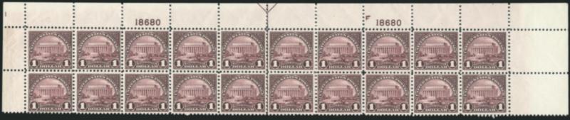 $1.00 Violet Black (571). Mint N.H. top arrow and double plate no. 18680 block of 20 with side selvage, Fine-Very Fine (Image)Search for comparables at SiegelAuctions.com |