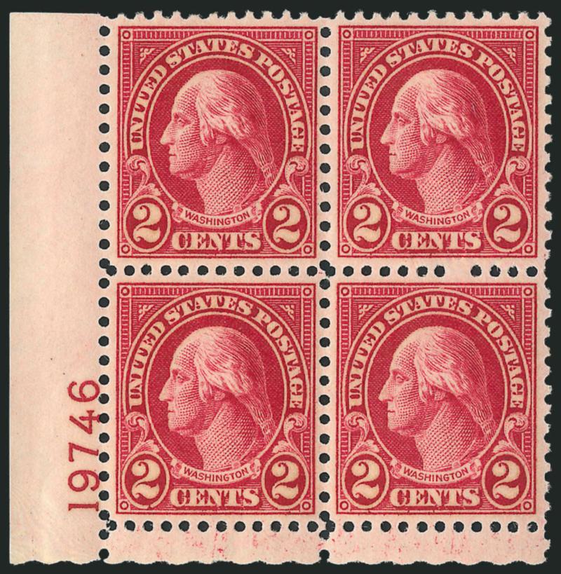 2c Carmine, Ty. II (634A). Mint N.H. bottom left plate no. 19746 block of four, incredibly well-centered for this tightly-spaced issue, marvelous deep rich color with clear impression, single