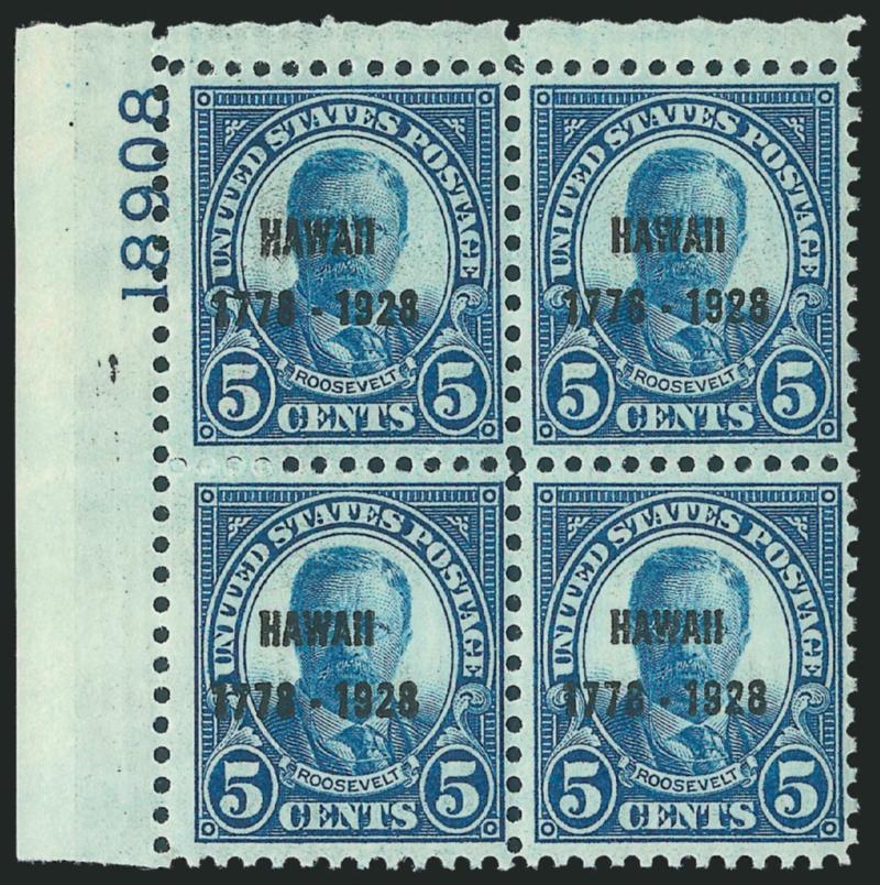 2c Molly Pitcher, 2c, 5c Hawaii, Ovpts. (646-648). Mint N.H. plate no. blocks of four, Fine-Very Fine (Image)Search for comparables at SiegelAuctions.com |