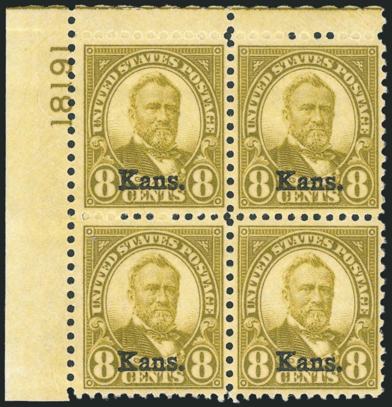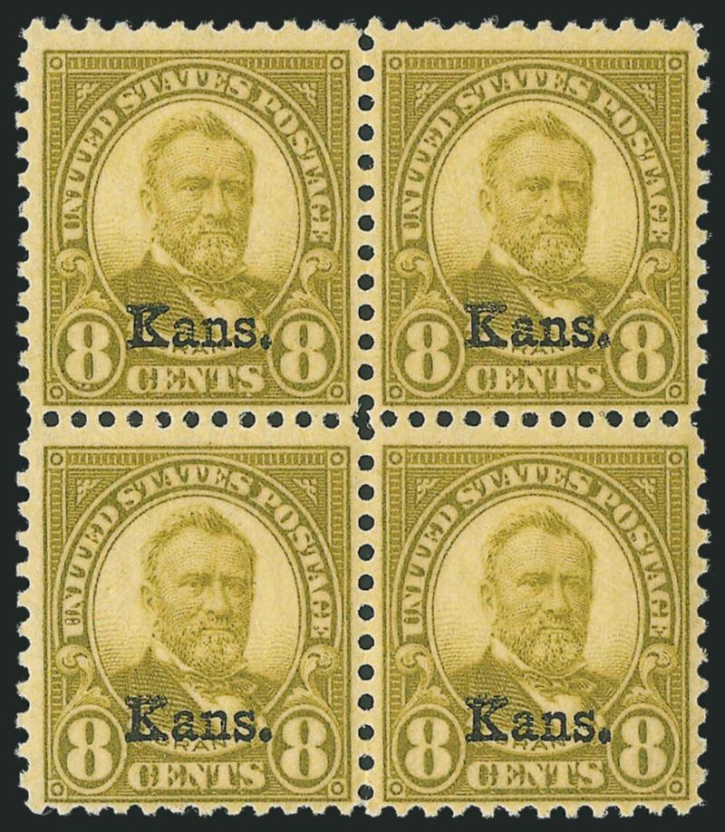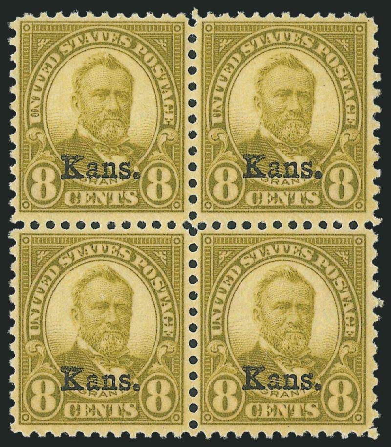 3c-10c Kans. Overprints (661-668). Mint N.H. blocks of four, bright colors, Fine-Very Fine (Image)Search for comparables at SiegelAuctions.com |