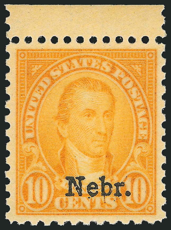 10c Nebr. Ovpt. (679). Mint N.H. with top selvage, wide perfectly balanced margins, fresh and crisp vivid color, Extremely Fine Gem, with 2010 P.S.E. certificate (Superb 98, SMQ $1,100.00) (Image)Search for comparables at SiegelAuctions.com |