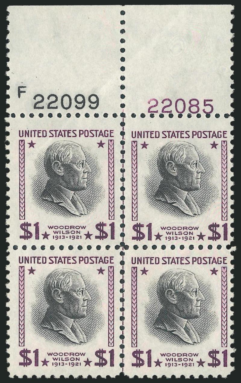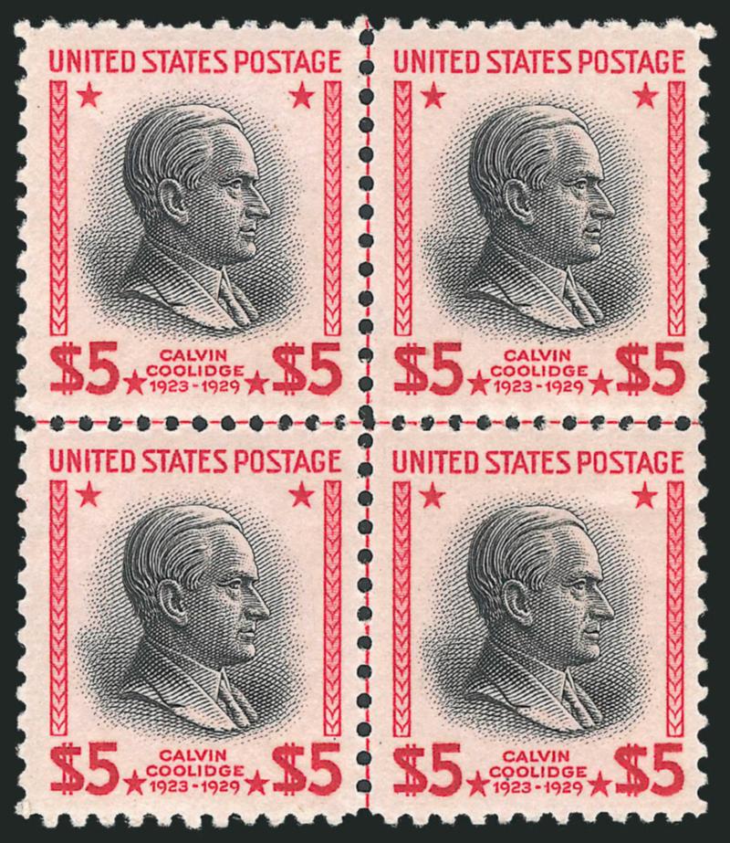 $2.00, $5.00 Presidential (834-834). Mint N.H. top double plate no. block of four and center line block of four respectively, bright colors, first with light natural gum crease, Very Fine (Image)Search for comparables at SiegelAuctions.com |