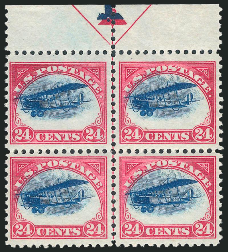 2146 ogbl Image24c Carmine Rose & Blue, 1918 Air Post (C3). Top arrow, double plate nos. 8493/8492 and two "TOP" block of twelve, hinged in selvage, stamps Mint N.H., gum crease at left from light pre-printing paper fold, Very Fine, Scott Retail as twelve Mint N.H. singles (Image)