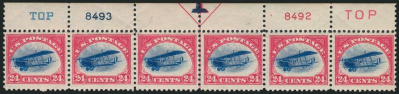 2145 nh Image24c Carmine Rose & Blue, 1918 Air Post (C3). Horizontal strip of six with arrow, double "TOP" and double plate nos. selvage, lightly hinged in selvage, stamps Mint N.H., natural gum bends, Fine-Very Fine, Scott Retail as six Mint N.H. singles (Image)
