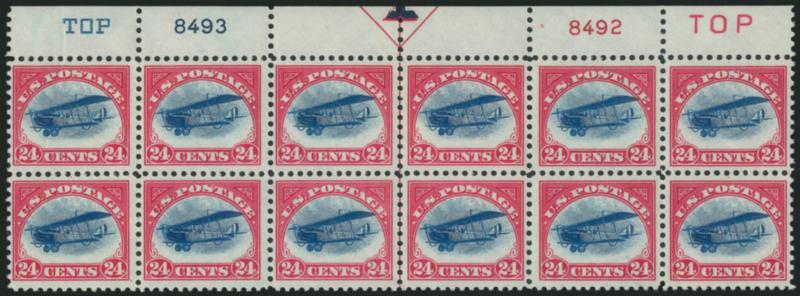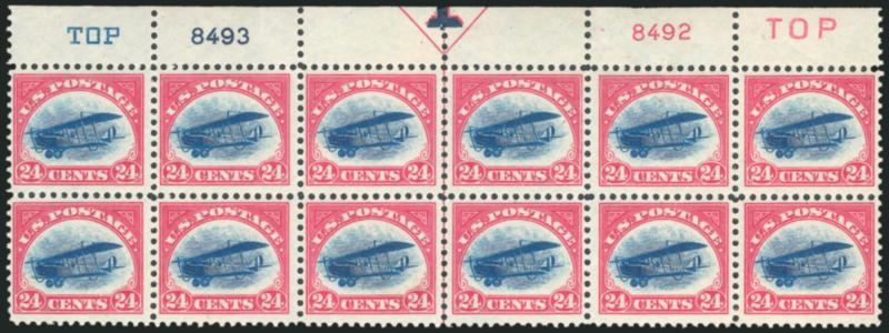 2147 ogbl Image24c Carmine Rose & Blue, 1918 Air Post (C3). Double "TOP", arrow and double plate nos. 8493/8492 block of twelve, msot stamps Mint N.H., fresh, bright colors, Fine-Very Fine (Image)