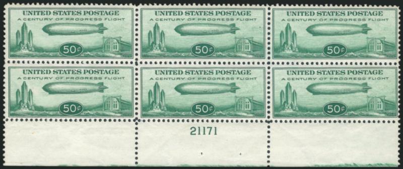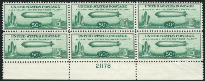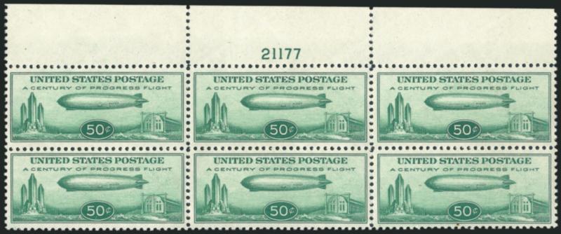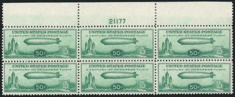 2203 nhbl Image50c Chicago Zeppelin (C18). Mint N.H. top plate no. 21177 block of six, wonderfully well-centered, fresh color, light natural gum skips as usual, Extremely Fine (Image)