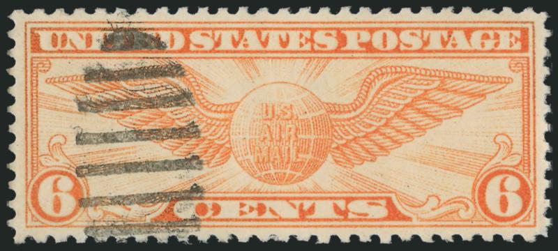 2207°   Image6c Winged Globe, Air Post (C19). Vivid color, mathematically perfect centering with wide margins, small part of duplex cancel, Extremely Fine Gem, the perfect used example of the 6c Winged Globe Air Post Issue, P.S.E. encapsulated (Gem 100, unpriced in SMQ above the grade of 98, SMQ $265.00 as 98 bears little relevance for this superb stamp), this is the only example graded 100 (there is one 100J) (Image)