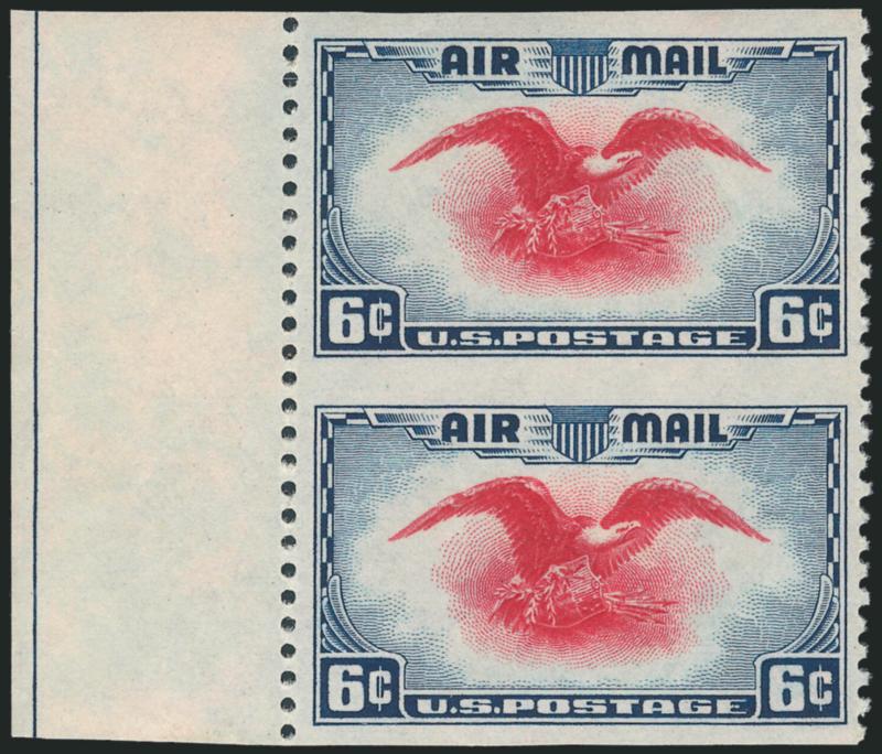 2208 nh Image6c Dark Blue & Carmine, Vertical Pair, Imperforate Horizontally (C23a). Mint N.H. with wide left selvage, large margins other sides, brilliant colors, light pencil notation on back on selvage, Extremely Fine (Image)