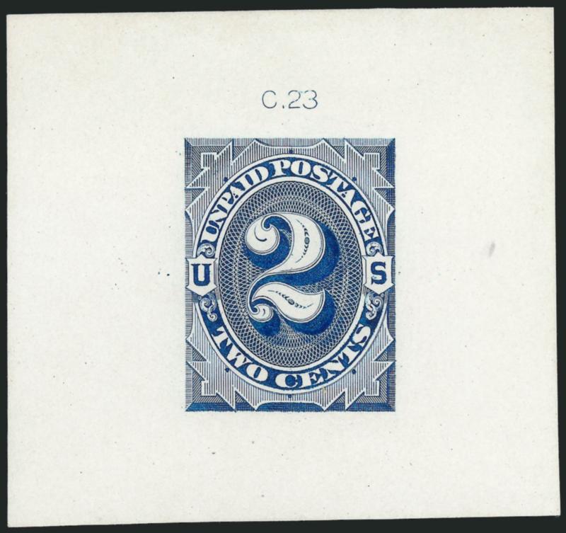 2c 1879 "Unpaid Postage" Die Essay, Blue on White Ivory Paper (J2-E1d). 52 x 48mm with "C23" die imprint at top, lovely color, Extremely Fine, very few known