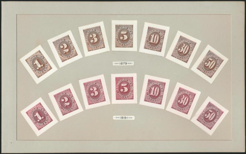 1c-50c 1879 and 1891 Postage Due, Small Die Proofs (J1P2-J7P2, J22P2-J28P2). Complete sets on full page from a Roosevelt Album, Very Fine-Extremely Fine, seldom seen today and one of only 85