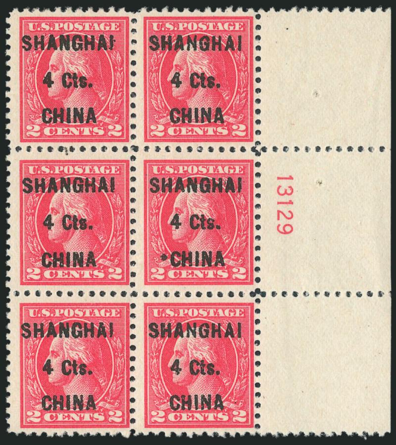 2341 nhbl Image4c on 2c Offices in China (K18). Mint N.H. right plate no. 13129 block of six, small circular spot of extraneous printing ink to left of "China" on pos. 4, resembles large period, Fine (Image)