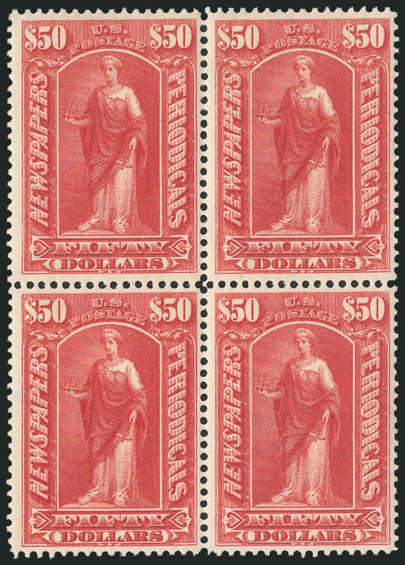 1c-$100.00 1895 Newspaper Issue (PR114-PR120, PR122-PR125). Blocks of four except $100.00 two pairs, all Mint N.H. except $10.00, $20.00 and $100.00 very minor gum disturbance from glassine