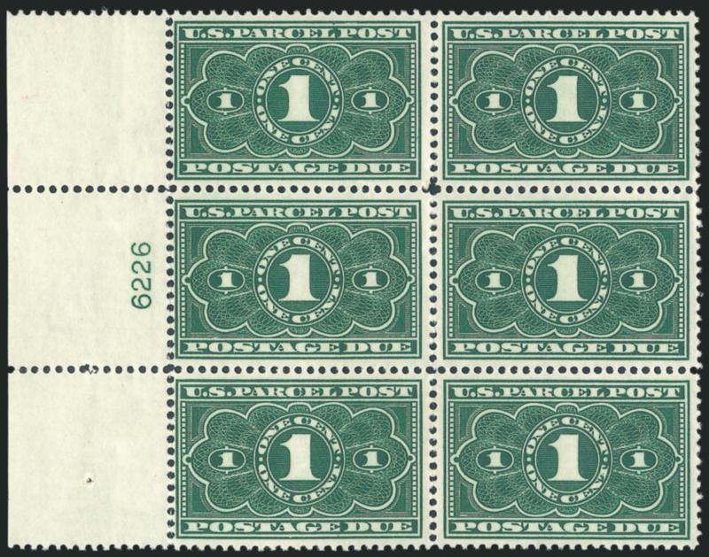 2447 nhbl Image1c Dark Green, Parcel Post Postage Due (JQ1). Mint N.H. left plate no. 6226 block of six, left perfs close on left three, Fine plate block (Image)
