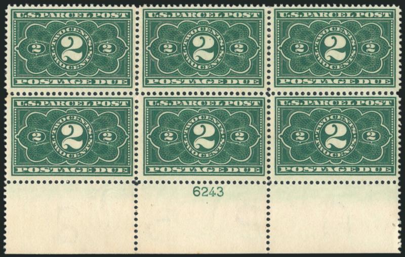 2449 ogbl Image2c Dark Green, Parcel Post Postage Due (JQ2). Bottom plate no. 6243 block of six, wonderfully fresh, some very skillful vertical perf strengthening visible under magnification (appears Mint N.H.), Fine-Very Fine, scarce plate block (Image)
