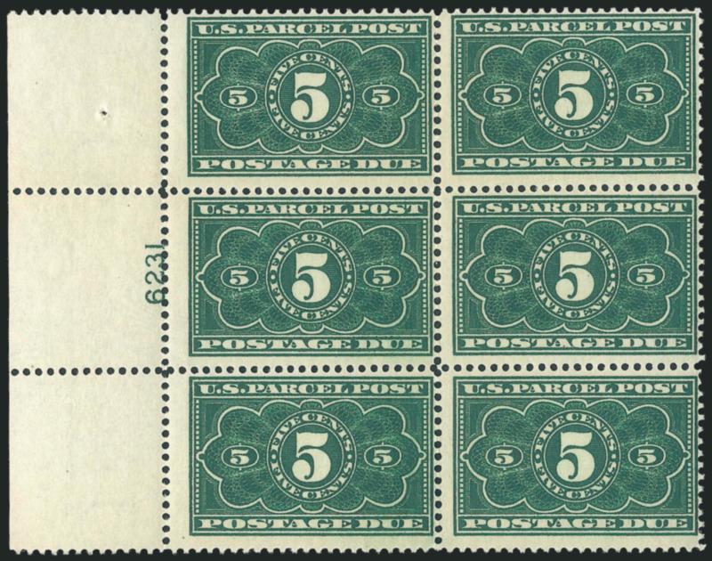 2450 ogbl Image5c Dark Green, Parcel Post Postage Due (JQ3). Left plate no. 6231 block of six, some very light perf strengthening, otherwise stamps Mint N.H., Fine (Image)