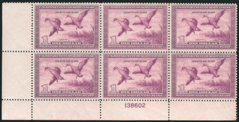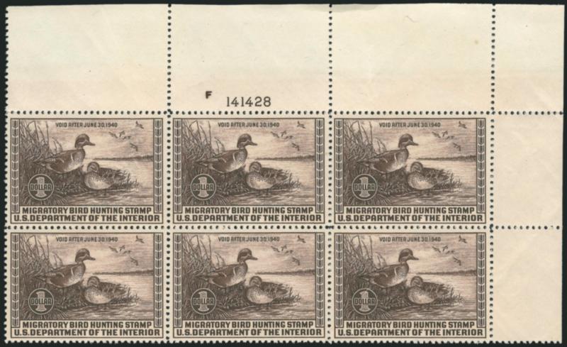 $1.00 1939 Hunting Permit (RW6). Mint N.H. top right plate no. 141428 block of six, tiny reduction of top selvage, some natural gum skips and two of the stamps have some unusual paper lumps, no