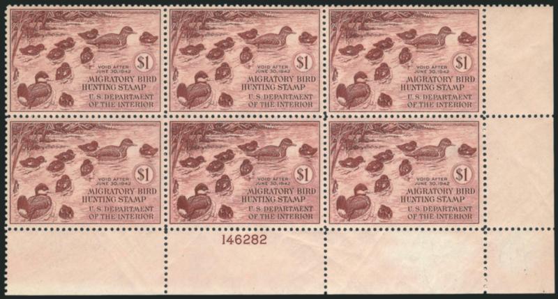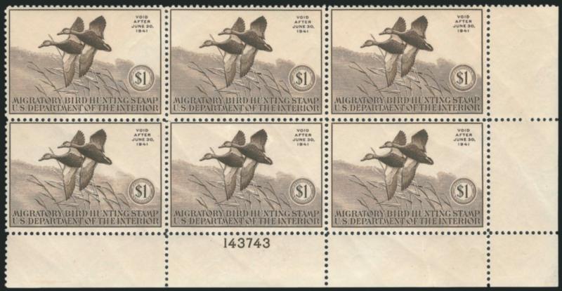 $1.00 1941 Hunting Permit (RW8). Mint N.H. bottom right plate no. 146282 block of six, beautiful rich color, usual light natural gum bends, erased pencil notation in corner selvage, otherwise