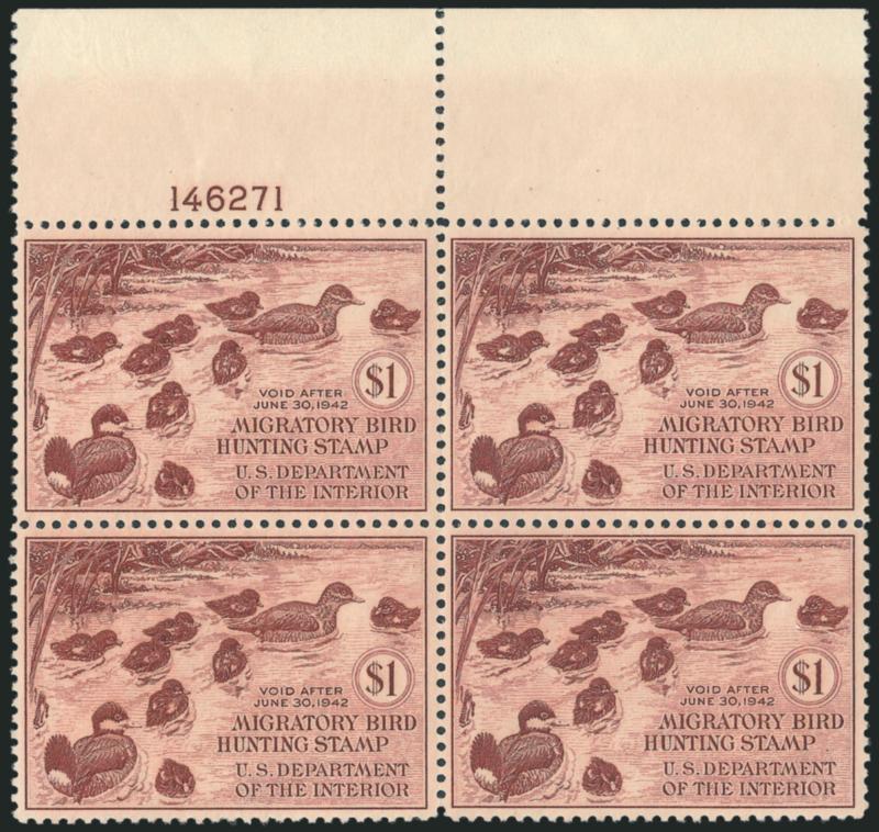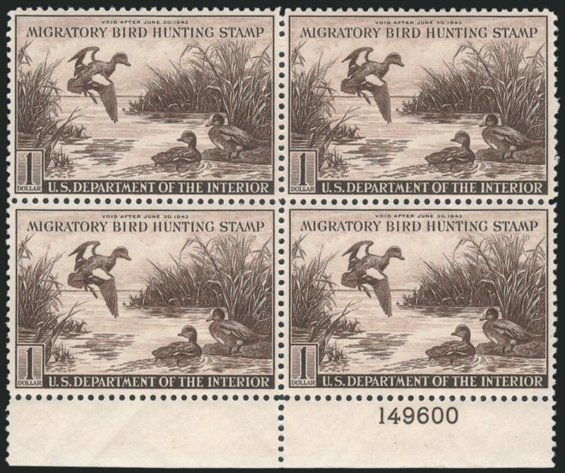 $1.00 1941 Hunting Permit (RW8). Mint N.H. top plate no. 146271 block of four, pretty color on crisp paper, excellent centering, Very Fine and choice, with 2011 P.S.E. certificate (Image)Search for comparables at SiegelAuctions.com |